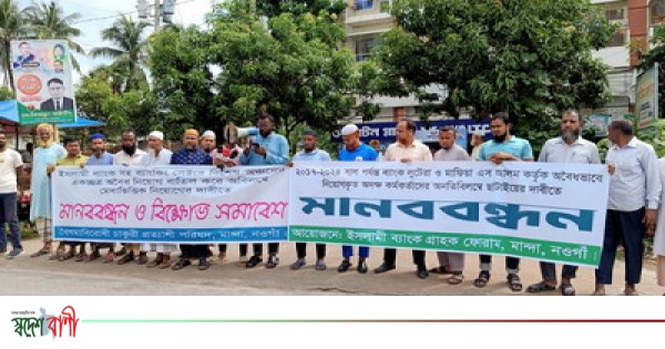 নওগাঁর মান্দায় ইসলামী ব্যাংক পিএলসি তে এস আলম কর্তৃক অবৈধভাবে নিয়োগ কৃতদের ছাঁটাইয়ের দাবিতে গ্রাহক ফোরামের মানববন্ধন অনুষ্ঠিত হয়েছে।