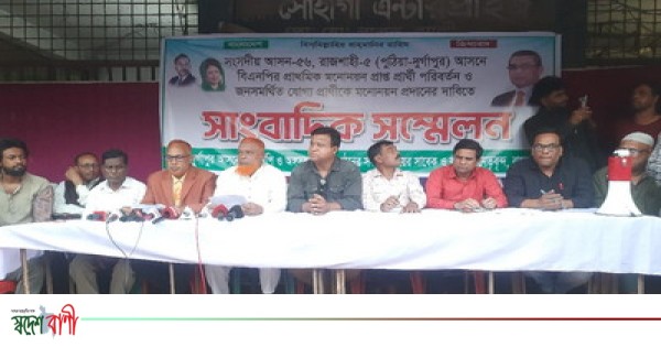 রাজশাহীর পুঠিয়া ও দুর্গাপুর উপজেলার বাংলাদেশ জাতীয়তাবাদী দল (বিএনপি) এবং এর অঙ্গ ও সহযোগী সংগঠনের নেতাকর্মীর উপস্থিতিতে এক গুরুত্বপূর্ণ সংবাদ সম্মেলন ও মানববন্ধন কর্মসূচি অনুষ্ঠিত হয়েছে। পুঠিয়া-দুর্গাপুর আসনে বিএনপির প্রাথমিক মনোনয়নপ্রাপ্ত প্রার্থী মোঃ নজরুল ইসলাম মন্ডলকে পরিবর্তনের দাবিতে এই সংবাদ সম্মেলন করেছেন অপর মনোনয়ন প্রত্যাশীদের সমর্থকরা।