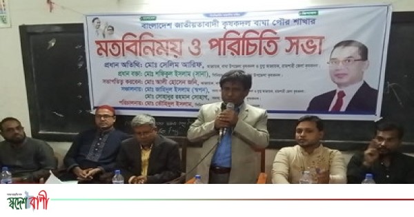 রাজশাহীর বাঘা পৌর শাখার জাতীয়তাবাদী কৃষকদলের পরিচিতি সভা অনুষ্ঠিত হয়েছে। শনিবার (১৫-১১-২০২৫) বিকেল ৪টায় রহমতুল্লাহ বালিকা উচ্চ বিদ্যালয় সম্মেলন কক্ষে পৌর শাখার আহ্বায়ক,আলী হোসেন জনির সভাপতিত্বে পরিচিতি সভা অনুষ্ঠিত হয়। এতে মালয়েশিয়া যুবদল এর মালাক্কা শাখার সাধারণ সম্পাদক ও কুয়ালালামপুর মহানগর বিএনপির সিনিয়র সহ-সভাপতি আরিফুল ইসলাম বিলাতের সার্বিক সহযোগিতায় ও উপজেলা কৃষকদলের সদস্য সচিব জাহিদুল ইসলাম স্বপন সরকারের সঞ্চালনায় প্রধান অতিথি হিসেবে বক্তব্য রাখেন, জেলা কৃষকদলের যুগ্ন আহ্বায়ক ও উপজেলা কৃষকদলের আহ্বায়ক সেলিম আরিফ। প্রধান বক্তা হিসেবে বক্তব্য রাখেন-উপজেলা কৃষক দলের সিনিয়র যুগ্ন আহ্বায়ক শফিকুল ইসলাম সানা।