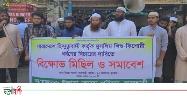 মুসলিম শিশু ও কিশোরীদের ধর্ষণের ঘটনার প্রতিবাদে রাজশাহীতে বিক্ষোভ মিছিল ও সমাবেশ অনুষ্ঠিত হয়েছে।