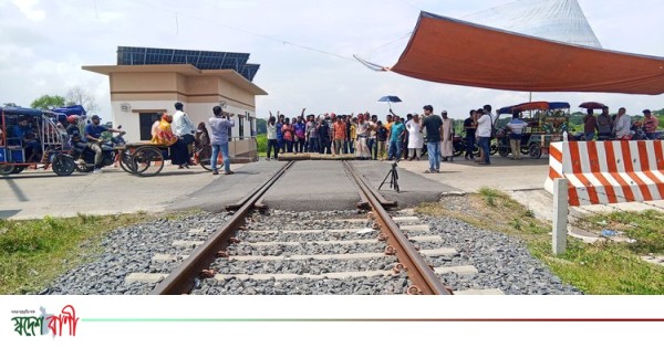 ভাঙ্গা উপজেলার কৈডুবি সদরদি এলাকায় রেলপথের ৮১ নম্বর গেটে গাছের গুঁড়ি ফেলে রেখে বিক্ষোভ করছেন আলগী ইউনিয়নবাসী।